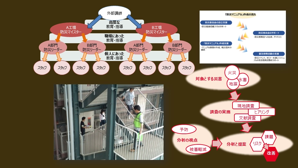企業の災害に対する対応力を分析する防災診断をはじめ、BCPの策定支援などを行います。