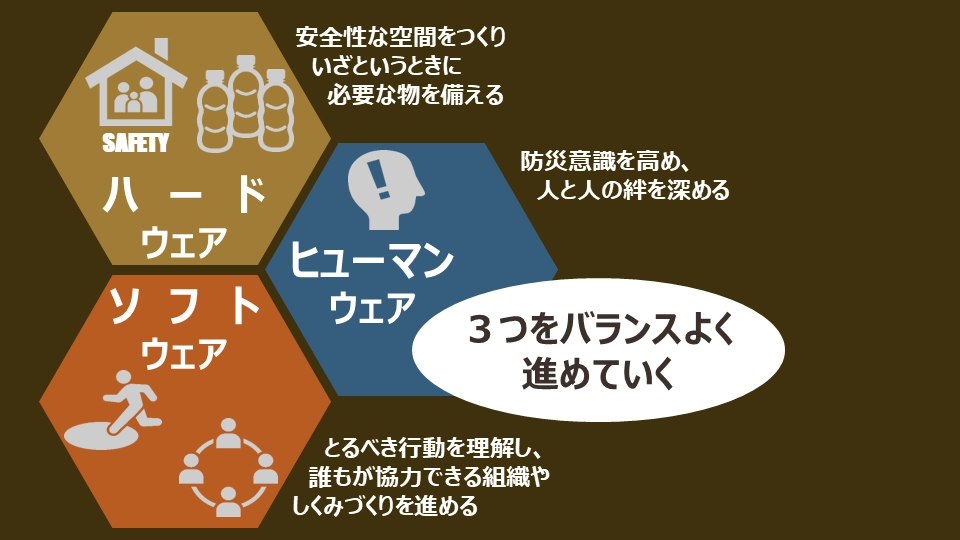 防災の主役は”人間”です。だからこそ従来から言われているハード、ソフトに”ヒューマン”という視点を加え、3つをバランスよく進めていくことが重要ではないでしょうか。